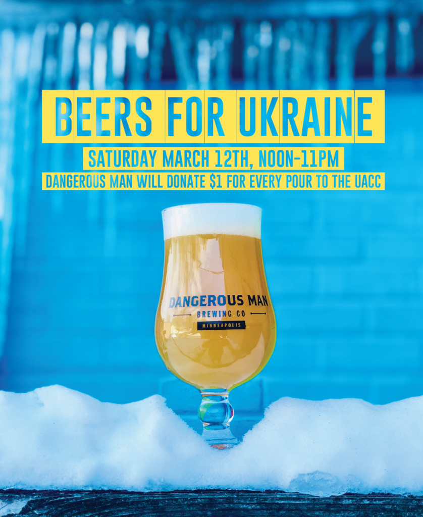 Join us on Saturday, March 12th, to drink beer for a good cause. Dangerous Man will be donating $1 to the Ukrainian American Community Center for every full pour served in the taproom. These funds will go towards aiding displaced refugees and the medical needs of wounded civilians and soldiers in Ukraine. We are open from noon to 11pm on Saturday, so grab your friends, drink beer, and do good.π»
