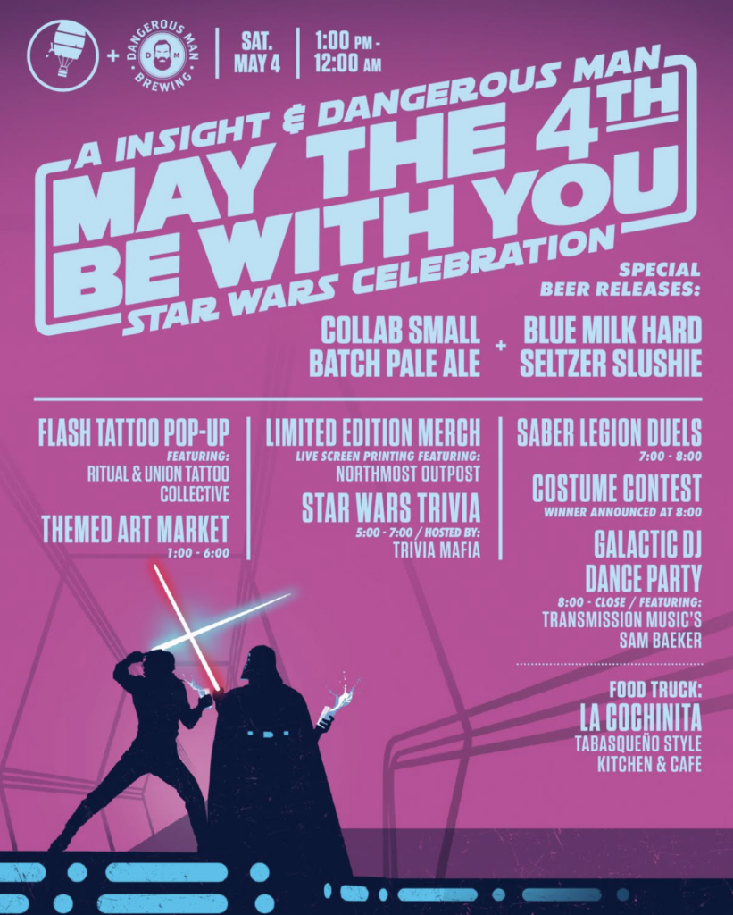 Dangerous Man is joining forces with Insight this May the Fourth to bring back our annual party at the @insightbrewing taproom! Join us Saturday, 5/4 at Insight Brewing for a FREE and unforgettable Star Wars celebration, featuring: